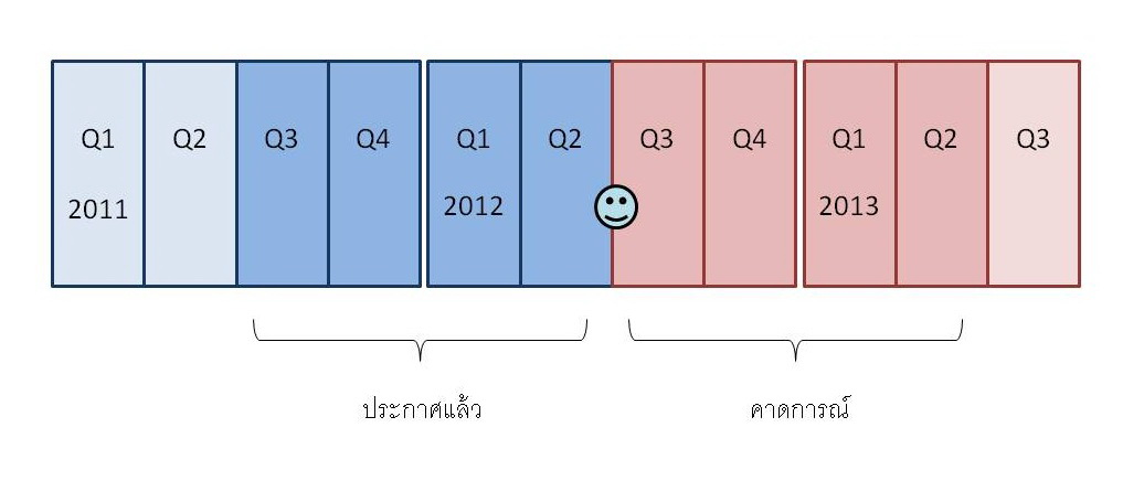 จากนั้นก็คำนวณในลักษณะเดียวกับ Trailing P/E ค่าที่ได้ออกมาจะเป็น Forward P/E ที่เราต้องการ (อาจใช้เครื่องหมายว่า P/E 2013F, P/E 2014F โดย F ย่อมาจาก Forecast เพื่อให้รู้ว่าเป็นค่า P/E ที่คาด)