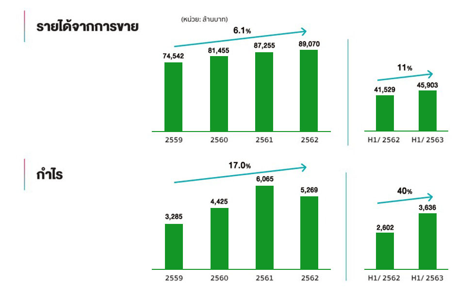 ขณะที่กำไรสุทธิมีอัตราการเติบโตกว่า 17.0% ซึ่งแสดงถึงความสามารถในการบริหารจัดการต้นทุนการเพิ่มประสิทธิภาพและการเติบโตของธุรกิจตลอดระยะเวลาที่ผ่านมาได้เป็นอย่างดี และล่าสุดในช่วงครึ่งปีแรกของปี 2563 SCGP มีรายได้จากการขายทั้งสิ้น 45,903 ล้านบาท เติบโตร้อยละ 11 จากช่วงเดียวกันของปีที่ผ่านมา