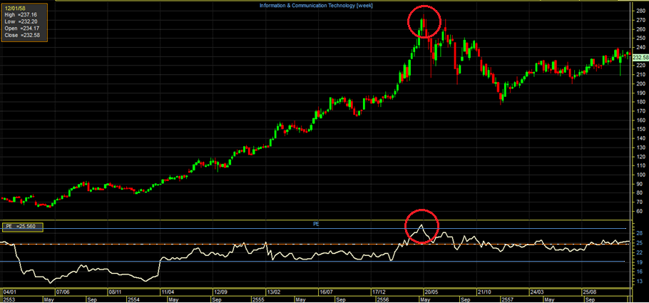 (ภาพบน) P/E Band ของกลุ่ม ICT (แนะนำให้คลิกที่ภาพแล้วลองซูมดูใกล้ๆ)